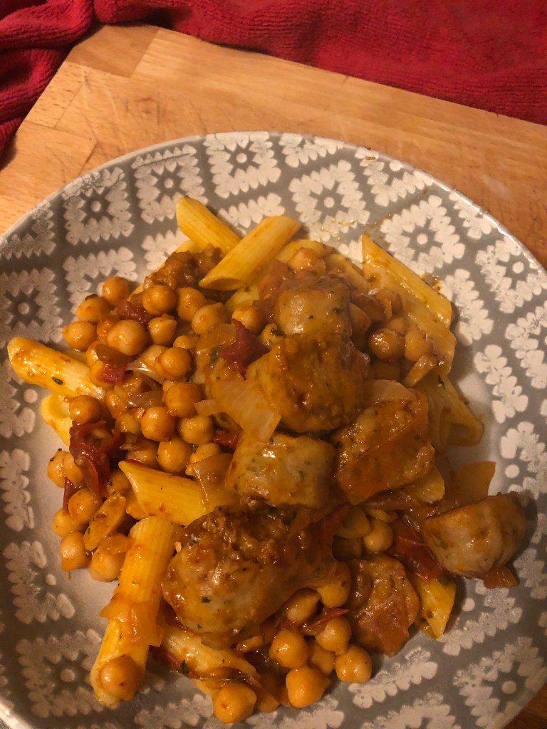 - Add sundried tomatoes, chopped sausages and chickpeas with a tin of water, cook down until the sauce becomes sticky.