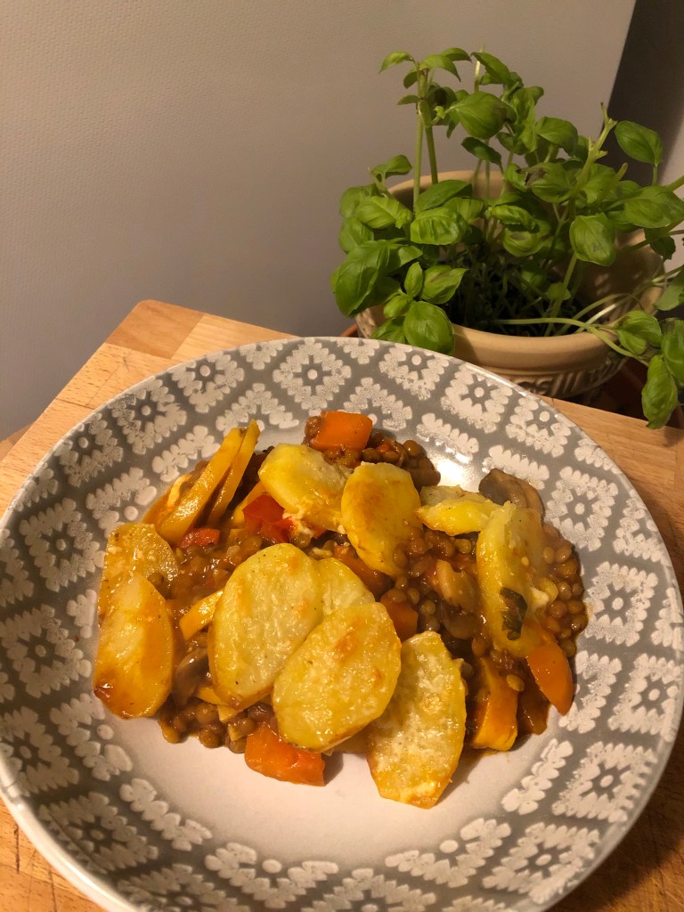 This is a hearty meal, including a rainbow of vegetables and filling lentils, topped with sliced baby potatoes and a little bit of cheese. As I cook for myself I tend to only do a couple of servings. You can of course double the ingredients to make more. Serves two
