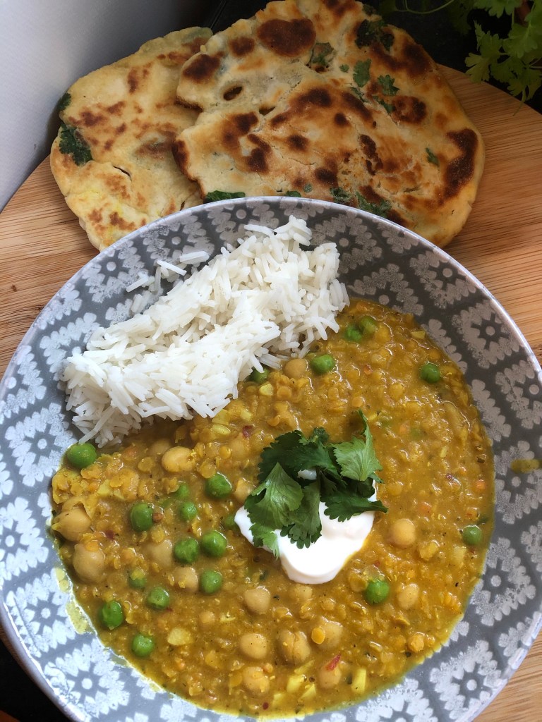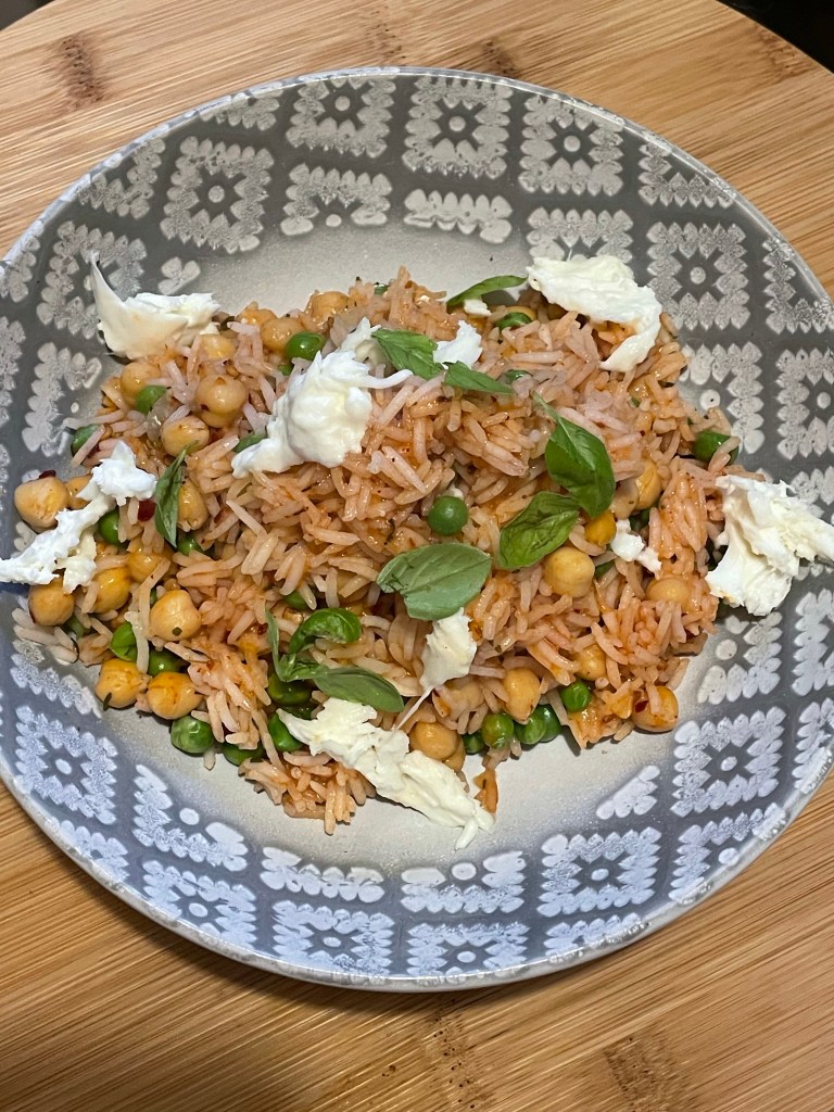 This was one of my quick and easy recipes. Sometimes a little too busy to plan, so it was a day that I used up some leftover chickpeas and frozen peas!!