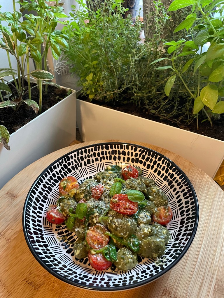 For this meal I basically used up all of the vegetables in my fridge, although I did seem to have a lot of Italian vegetables. It was a really lovely change, tasted amazing and I added a piece of salmon for protein and a little bit of feta (not shown), but you could add some chickpeas. Very simple and easy to cook, just chop and place all vegetables on a baking tray, drizzle with capers, chilli, oil, herbs and then cook, adding the kale at the last 5-10 minutes. You then get a lovely crispy kale. Served with a green salad. Serves 2