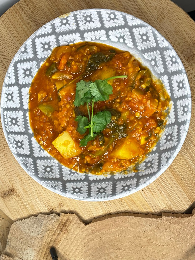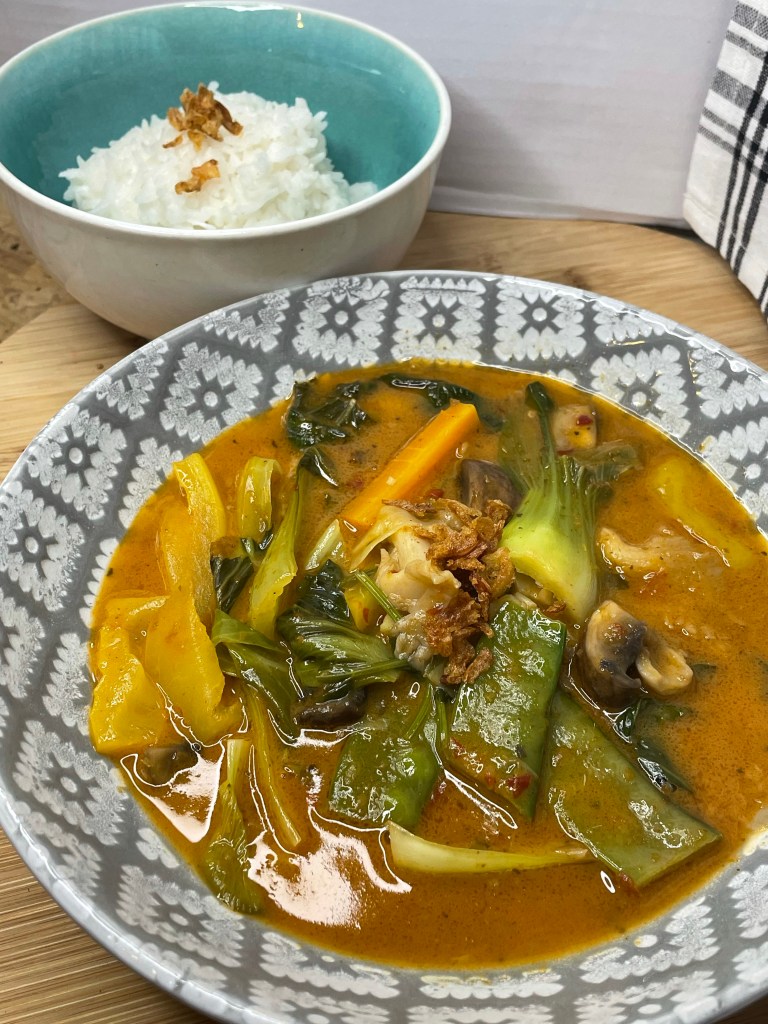 Delicious, nutritious and using up all of the almost ready to throw out vegetables in the fridge. It is so easy to do a one pot curry, using the casserole dish on the stove and using lots of great flavours. It does not matter that the vegetables are a little bit limp! Making a curry is also good because the flavours only enhance over time, so cooking it in advance or keeping it in the fridge for a couple of days is perfect. This was enough for 3 servings.