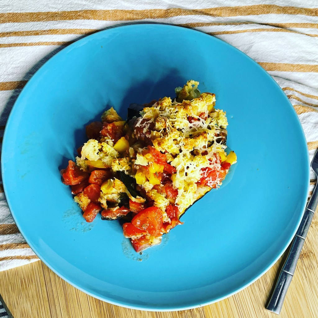 3. Put zucchini skins into a casserole dish and add the mixture. Top with breadcrumbs, I just tore the bread up, together with some grated cheese. Cook for about 20 minutes, you can cook for longer, but I couldn’t wait!