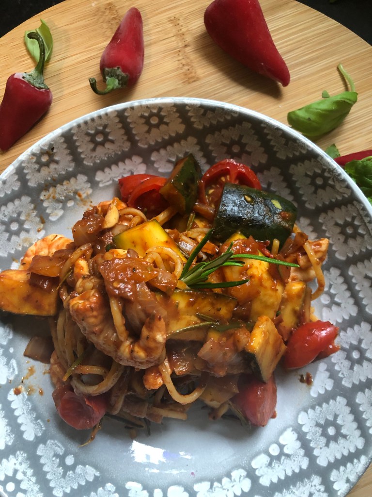 Smoky tomato, zucchini and Prawn Pasta