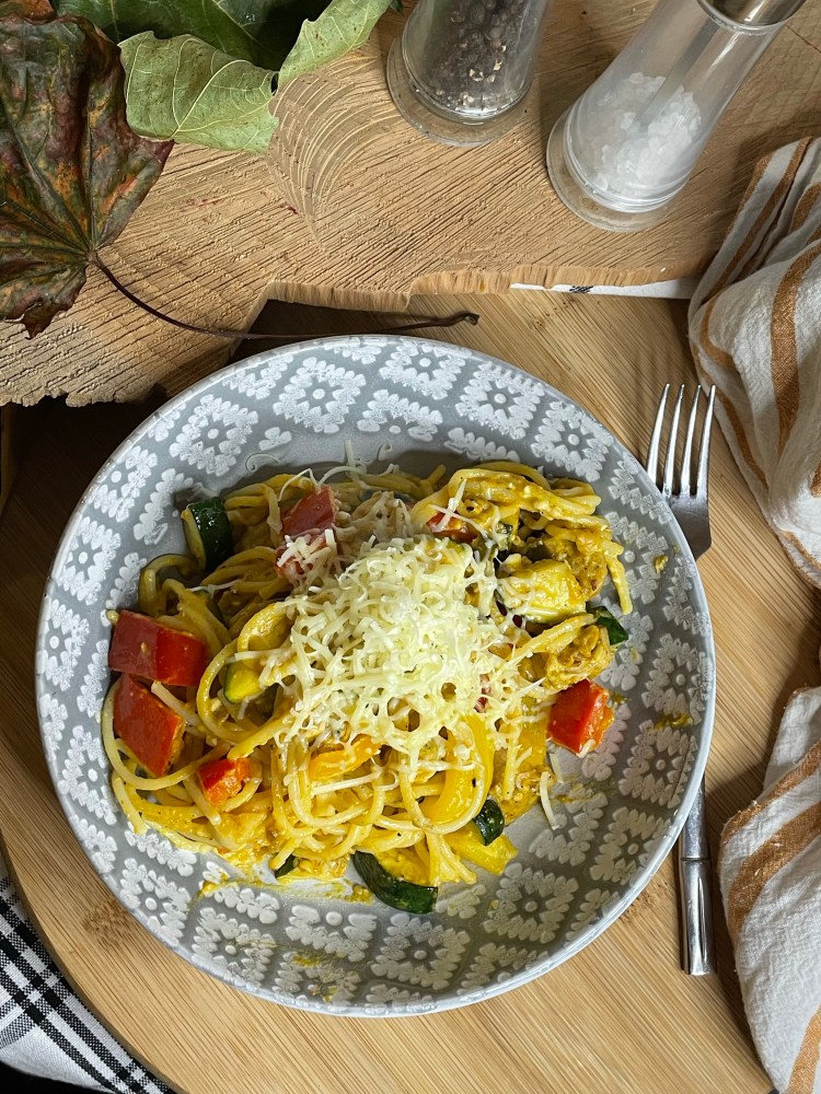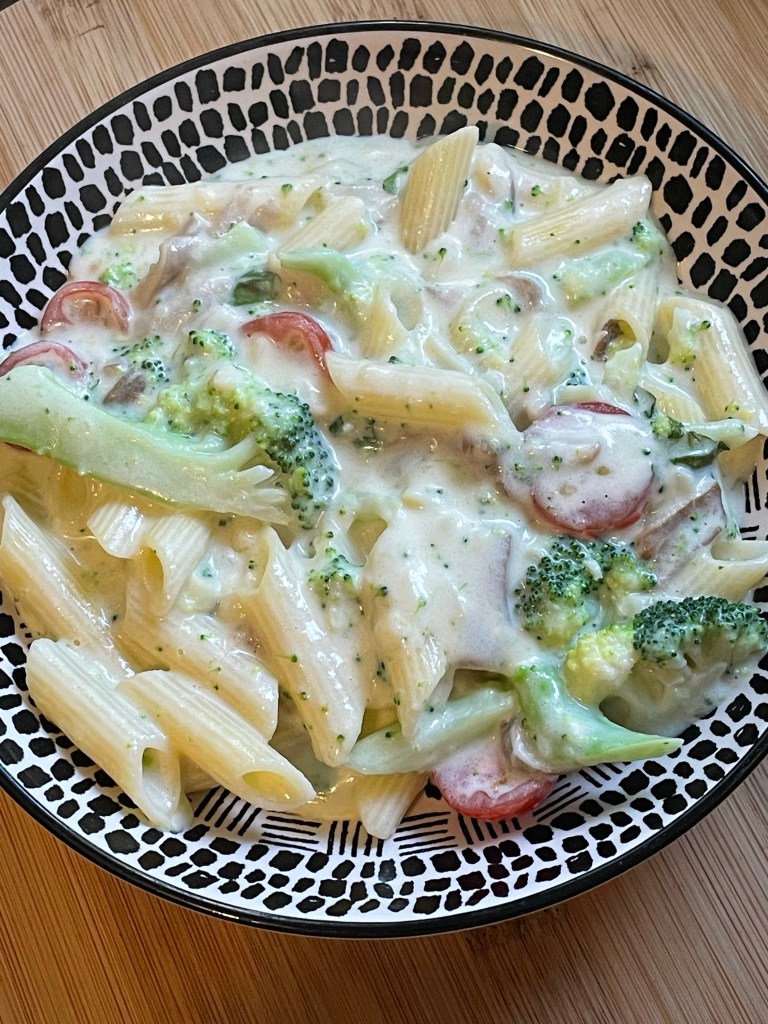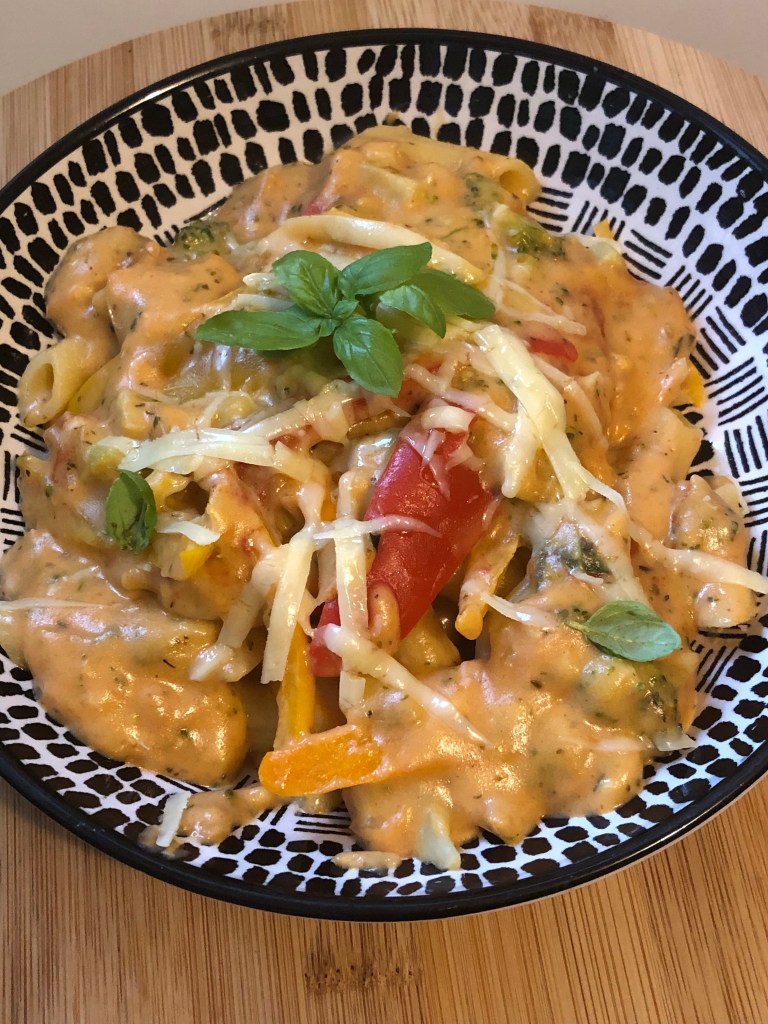A definite quick and easy pasta, for a mid week meal. Who doesn’t want life to be simple. I love Smokey cheeses and this was made with a Smokey vegan cheese. So this meal can be made totally vegan if you use an alternative milk, like oat and it is totally gluten-free. 1 serve
