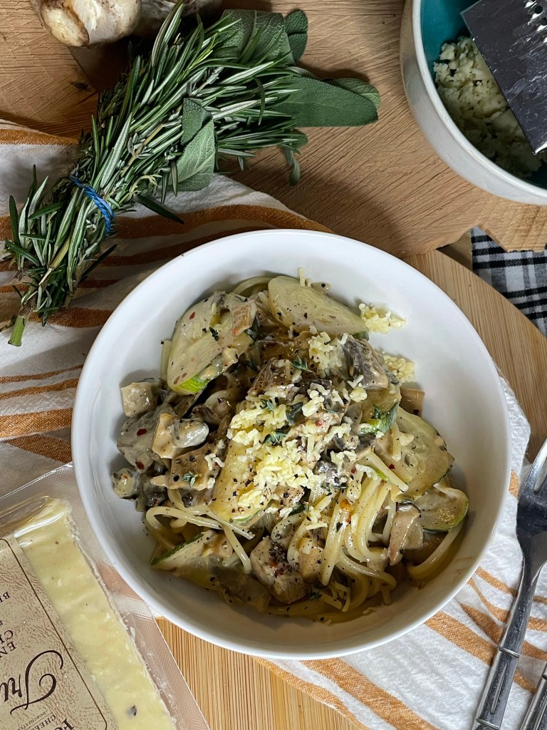 Well I really enjoyed this quick and easy spaghetti dish. Full of fresh herbs, like rosemary and thyme. A simple creamy sauce, with the mushroom flavour and herbs, so good. I always use gluten free pasta, I find my food intolerances have calmed down since eating it. The pastas you get now are really good, you might have to try a few makes before you find the ones you like though. Just make sure the water is boiling before you add the pasta. I used some truffle cheese for the top, it was delicious, I do not normally have much cheese and do only have lactose free, but I saw this and could not resist! You can however freeze cheese, so instead of making yourself ill by eating a whole block, just have a little and then freeze it for another time. I tend to cut my cheese up in small blocks and freeze. That way if I fancy just a little bit, I can have it, without getting sick because I only have a little as a treat every now and then!