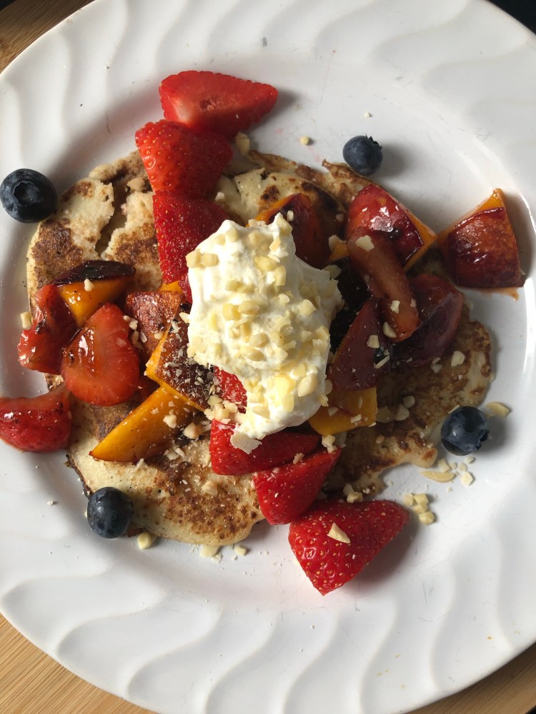 - For half of the fruit, I added to the pan at the end of cooking the pancakes, and fried off the fruit, with a spoonful of honey. Added to the fresh fruit and a dollop of yoghurt and a scattering of nuts.